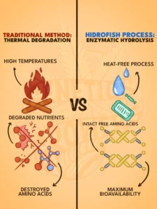 Unlike other fish-based products, Hidrofish uses a hydrolysis process without temperature delta, allowing proteins to be broken down into their most bioavailable form: free amino acids. This method avoids thermal degradation of nutrients and significantly reduces processing time—from several months to just a few weeks.