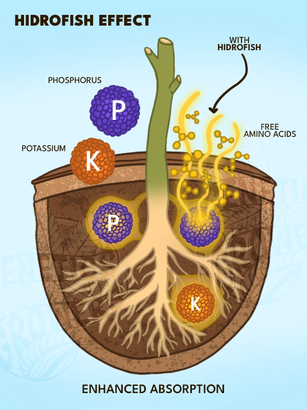 Beyond direct nutrition, Hidrofish functions as a fertilization adjuvant in nutrient programs and phytosanitary management. By improving nutrient assimilation, it enhances the effectiveness of phosphorus, potassium, and disease-control products.