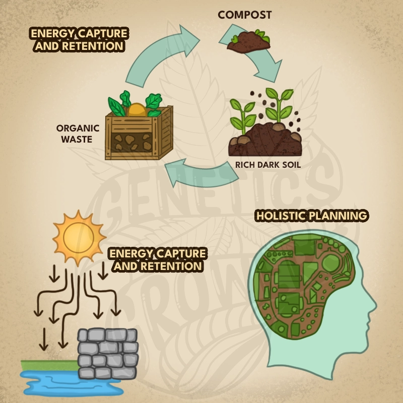 - Energy Capture and Retention: Designing systems that efficiently collect and store sunlight, water, and organic matter.