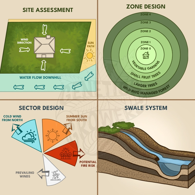 Permaculture zones organize space based on frequency of use, placing high-maintenance plants near the home and low-maintenance systems further away. Sector planning accounts for natural forces like wind and sunlight, guiding the placement of windbreaks and shade structures (Mollison, 1988).